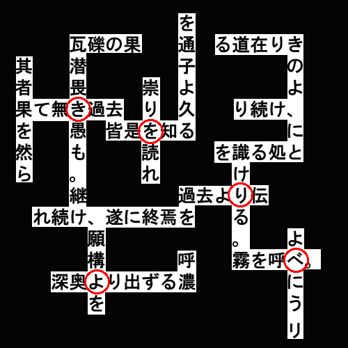 (確かに、文章の縦横にそのまま迷路を載せても、かっちりと合わさるわけではありません。迷路左下に伸びる通路が何も文字を拾わず、据わりが悪いのです)